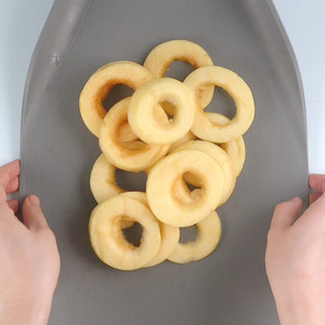 1.苹果去皮横着切片,切好的片用勺子沿着果核位置转一圈将中间挖空。