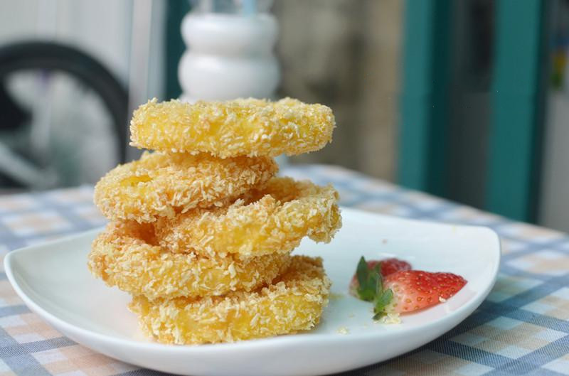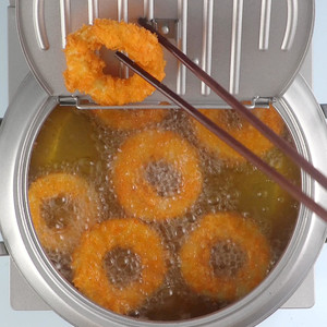 将苹果圈放入热好的油锅,转中小火炸至金黄即可食用。