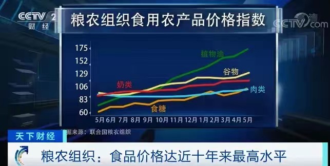 联合国粮农组织3日公布的数据显示,今年5月份,“粮农组织食品价格指数”平均为127.1点,环比上升4.8%,同比增长高达40%,标志着食品价格指数连续第12个月上行,攀升至近10年来的峰值。咖啡和茶的交易价格也在明显走高。