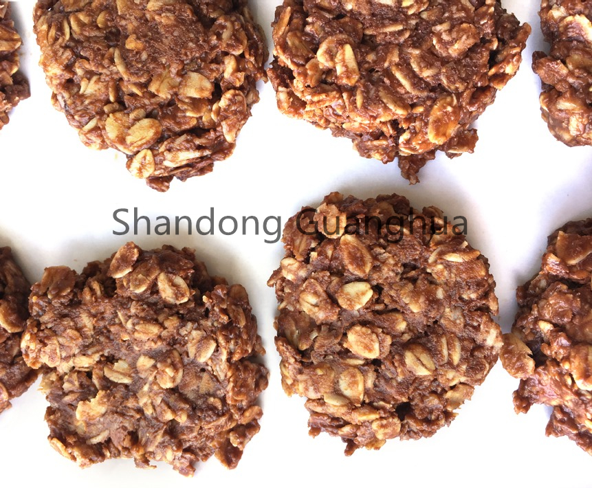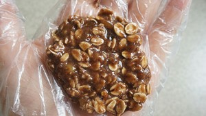 3.戴好一次性手套后,取40克左右的燕麦混合物摊在手掌里,将其微微压扁
