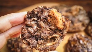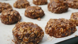 4.舀一勺约5克左右的花生酱放在燕麦上,两个手掌将燕麦泥轻轻向中间推,将花生酱包裹在燕麦泥中间