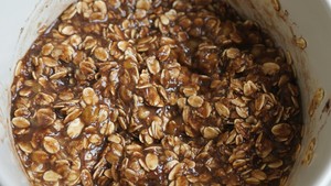 2.然后倒入150克即食燕麦,再打入一个鸡蛋,拌匀后倒入10克可可粉,再次搅拌均匀