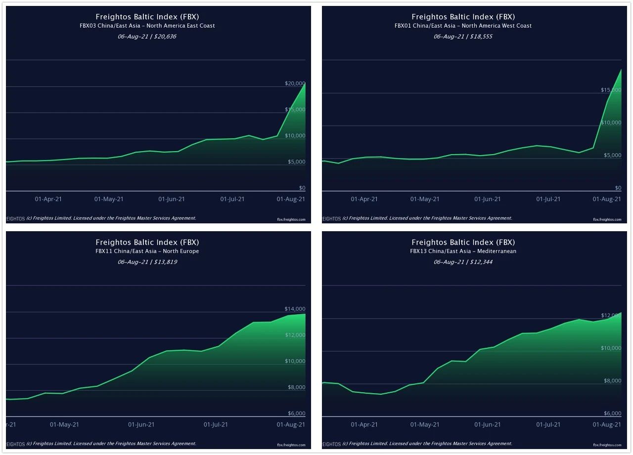 7月28日,波罗的海日运价指数(Freightos Baltic Daily Index)调整了其跟踪海运费率的方法,将预订所需的各种保费附加费包括在内,大幅提高了货主实际支付成本的透明度。目前最近的该指数显示: