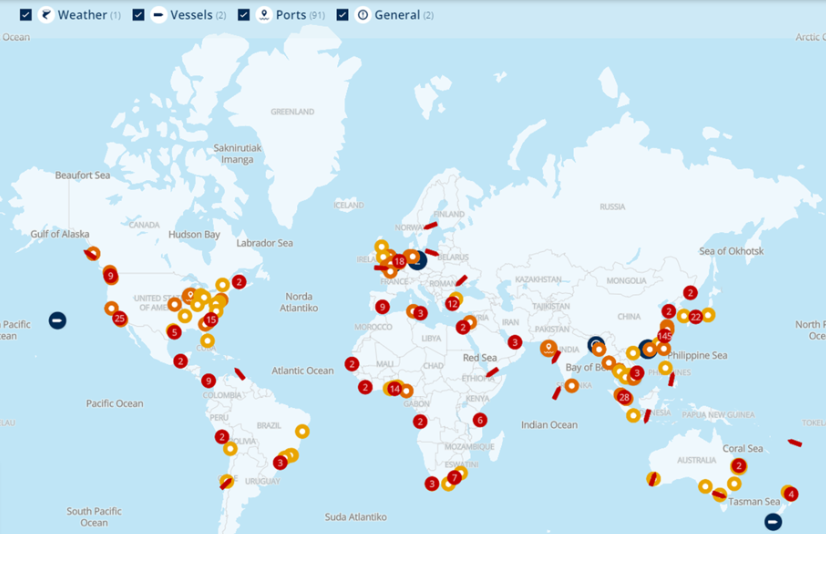 (红点代表船舶群,橙色代表拥堵或运营中断的港口)