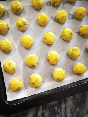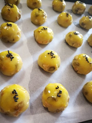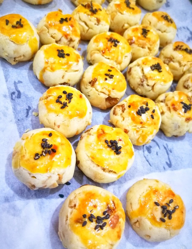 熟花生碎80克,葡萄干60克,玉米油40克,猪油35克,细砂糖65克,鸡蛋2个,低筋面粉185克,泡打粉3克,盐1.5克,黑芝麻适量