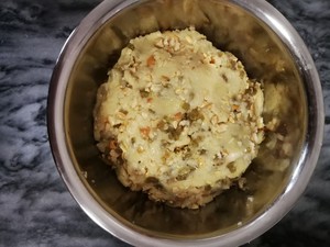 步骤10. 把花生碎跟葡萄干倒进面团里抓捏均匀。请不要过度搓揉面团使面团起筋。