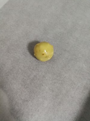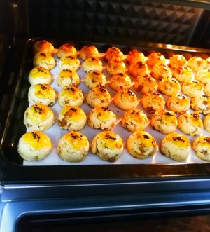 步骤12. 把面团分成12-15克的小团。用左手托住,右手抓捏转圈团成圆形。放进烤盘稍轻压一下。就是会变成蘑菇半圆形的。