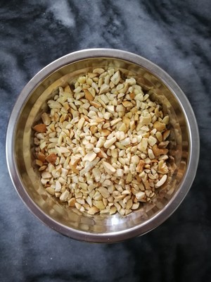 步骤1. 花生提前炒好去衣用擀面杖擀碎,喜欢吃颗粒感的就不要擀太碎。反之不喜欢吃的可以擀碎点。