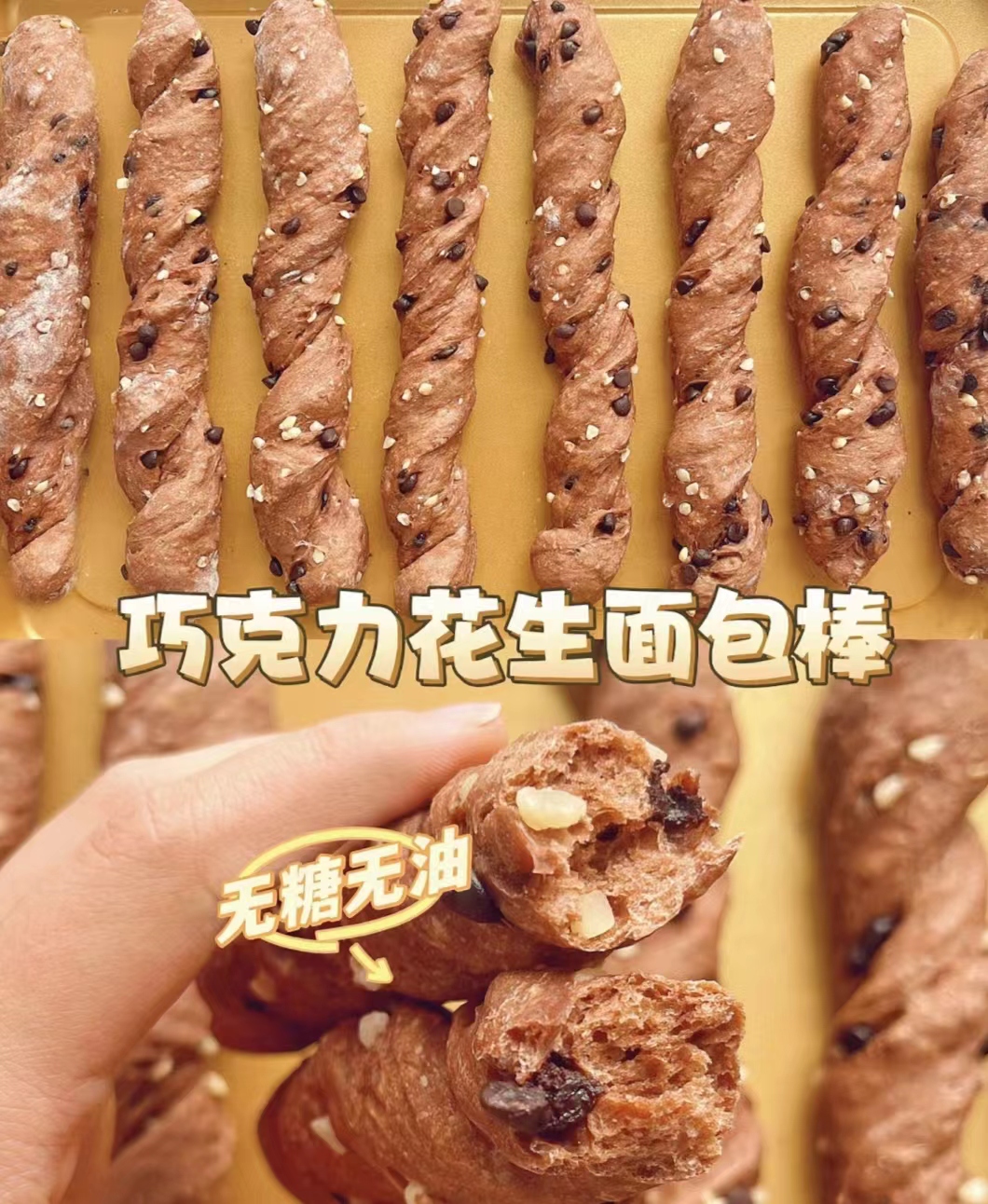 无糖无油的巧克力花生面包棒,不用厨师机不用揉面就能轻松做出来松松软软的面包棒,烘焙小白也能独立完成,快来试一试吧!
