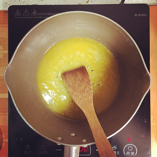 3.剩余的50g黄油与砂糖60g放入锅中小火加热至融化。