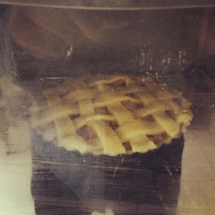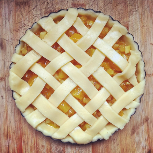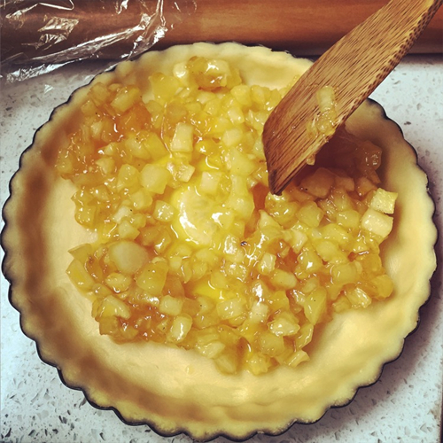 9.处理完外皮部分,苹果馅儿也做好了,倒入做好的派皮,晶莹剔透,香气扑鼻。