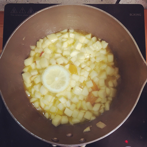 4.加入苹果丁和柠檬不断翻炒,保持小火。