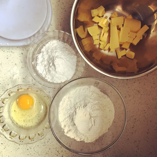 2.将80g黄油软化,加入糖粉和蛋液,搅拌均匀加入低筋面粉,揉搓成团用保鲜膜包裹,放入冰箱。