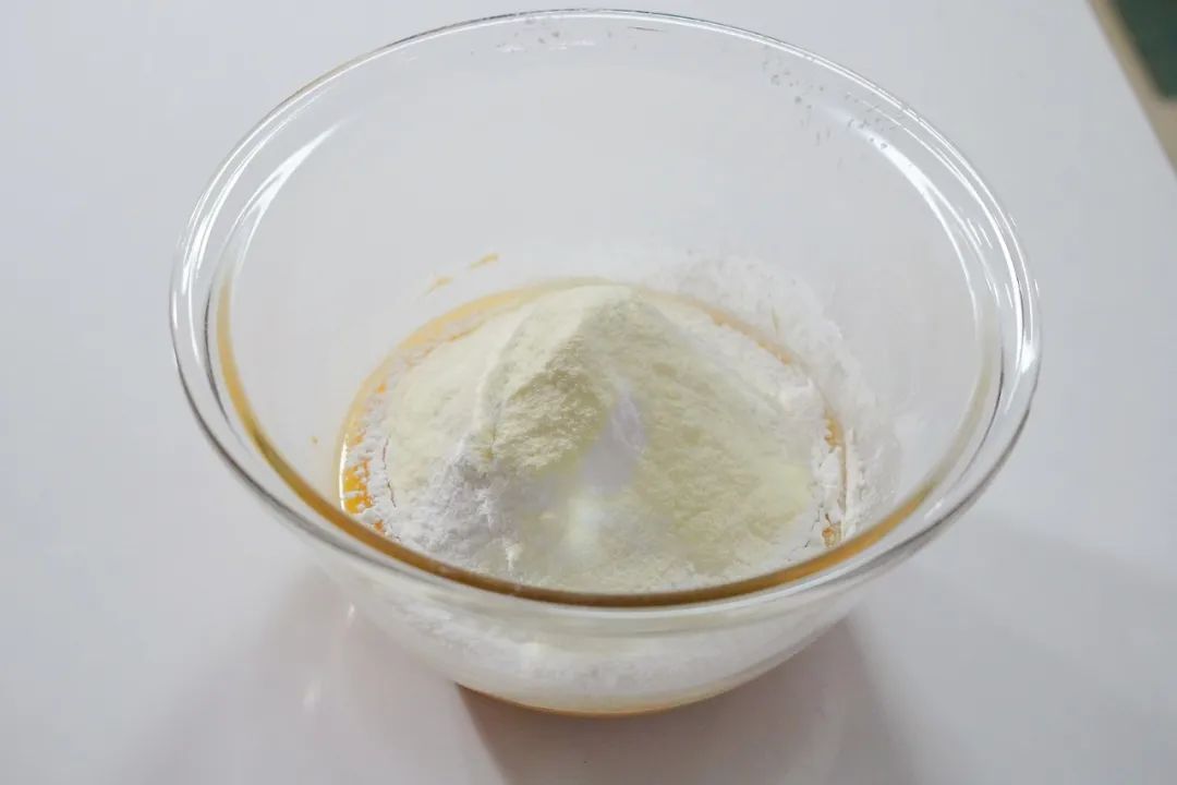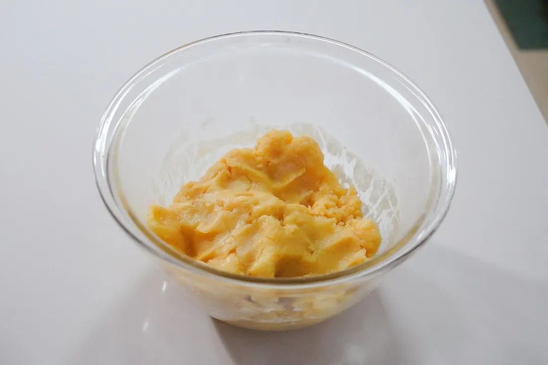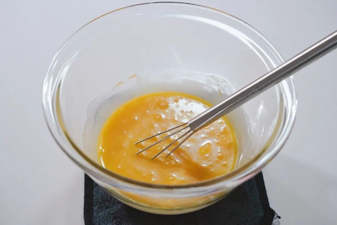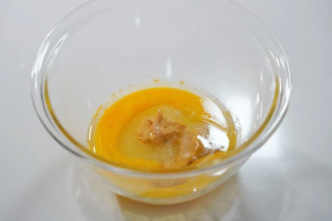 1.在全蛋液中加入玉米油、花生酱、盐和糖后搅拌均匀。