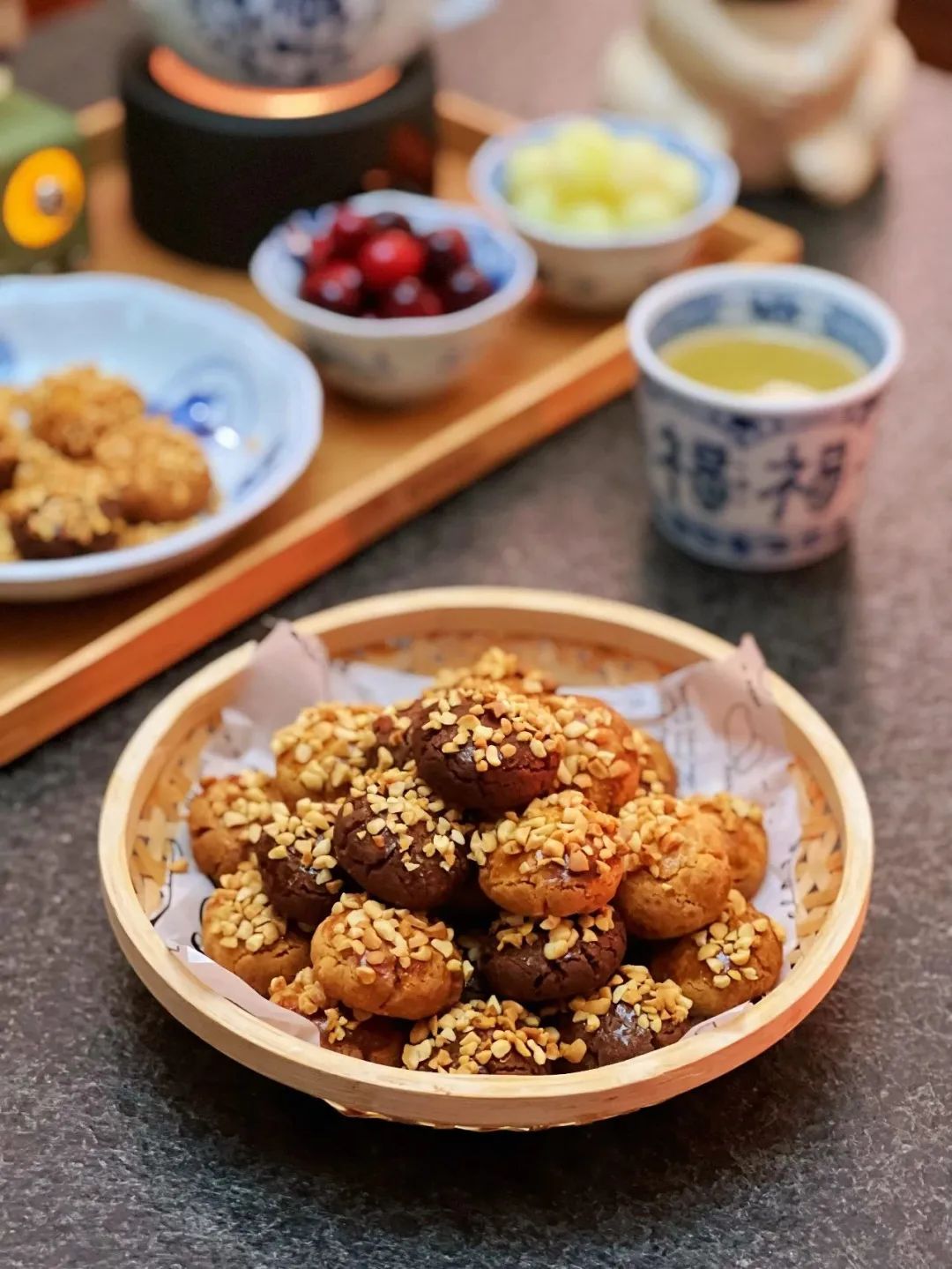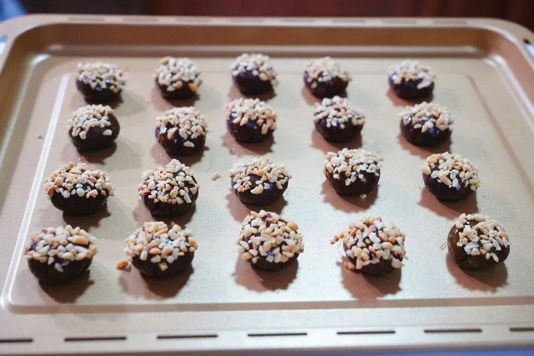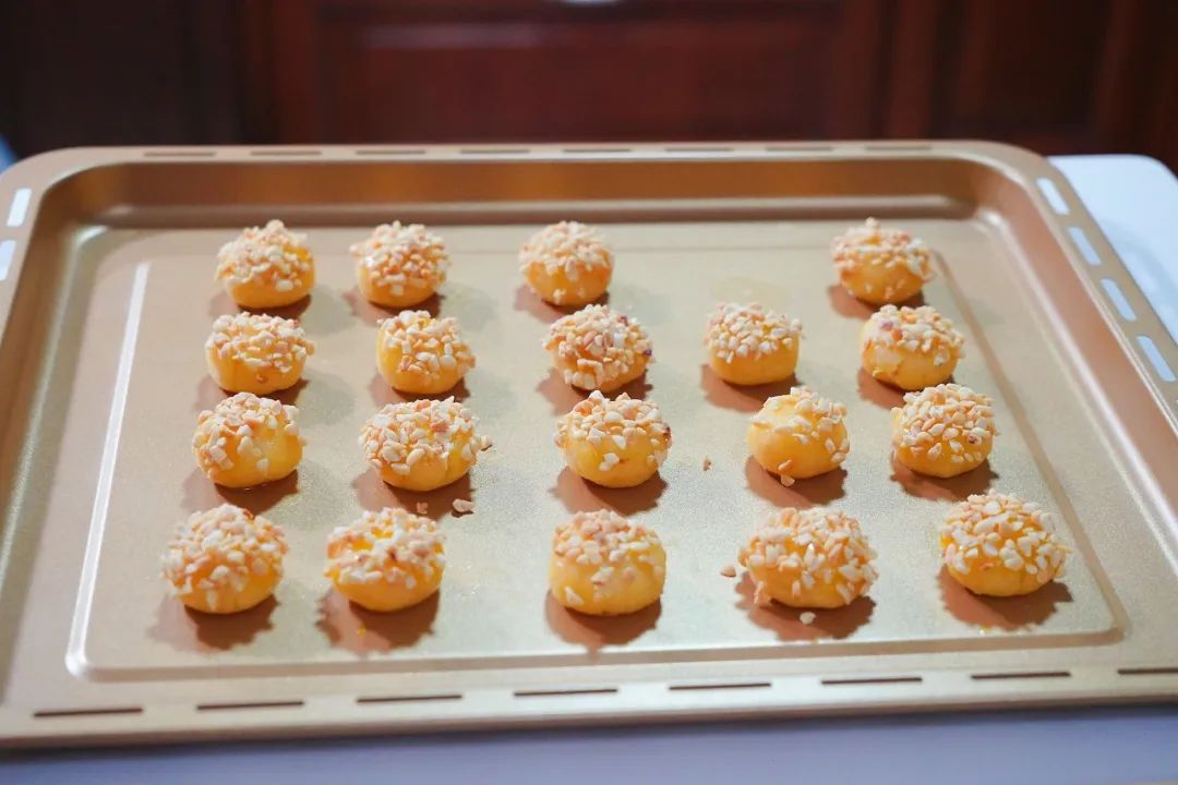 6.在小圆球表面刷蛋黄液,撒上花生碎。