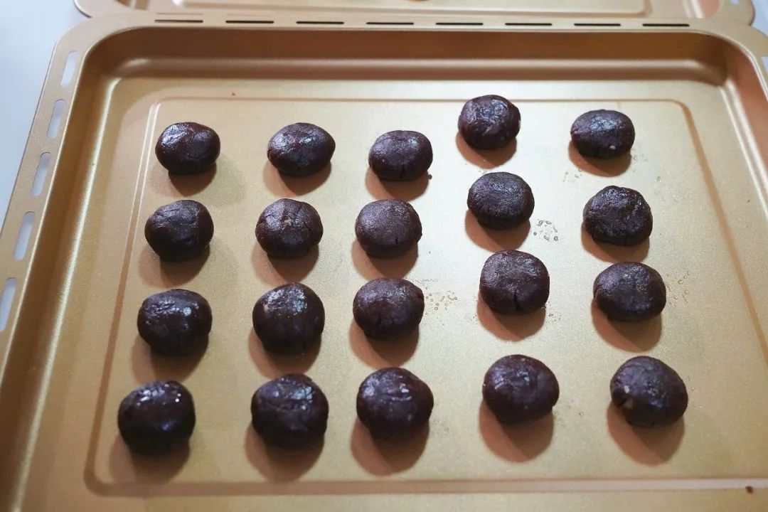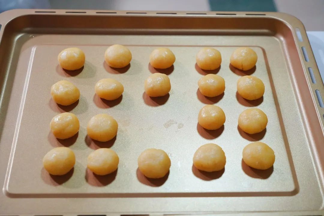 5.把面团分成小圆球,每个约15克,再把小圆球微微压扁。