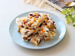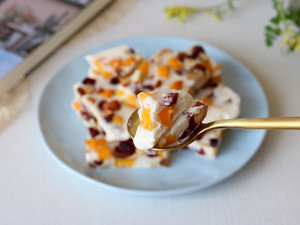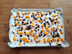 步骤6. 最后把剩下的另一半芒果肉、甜杏仁、蔓越莓和葡萄干均匀地撒上酸奶上,尽量撒均匀一些。放到冰箱里零下18度的那一层冷冻4-5个小时,具体时长要看酸奶的厚度。