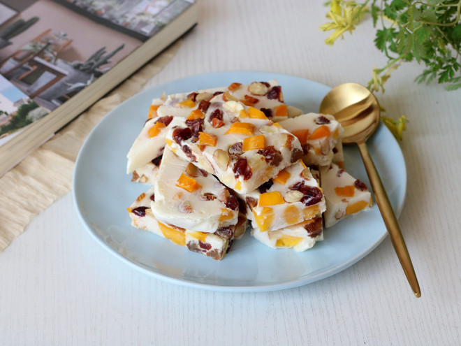 步骤7. 炒酸奶做好以后,带着油纸提出来,用刀切成小块用勺子舀着吃。