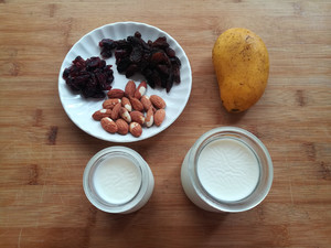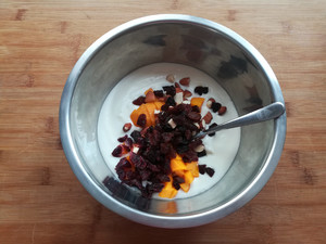 步骤4. 把酸奶倒入深的盆子里,放入一半芒果肉、甜杏仁、蔓越莓干和葡萄干,搅拌均匀。