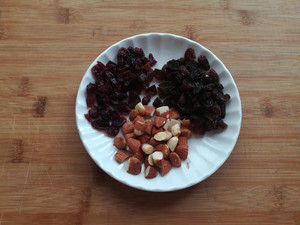 步骤2. 蔓越莓干切成小颗粒,葡萄干切成小颗粒,甜杏仁切成两半。