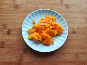 步骤3. 芒果去皮去核,芒果肉切成跟甜杏仁差不多大的颗粒。