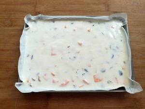 步骤5. 准备一个有深度的长方形盘子,垫一张油纸,把搅拌均匀的酸奶和水果干倒入盘子里,用勺子刮平一些。