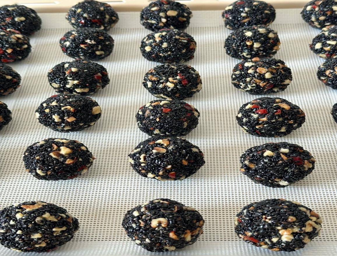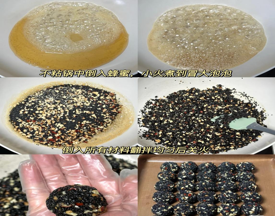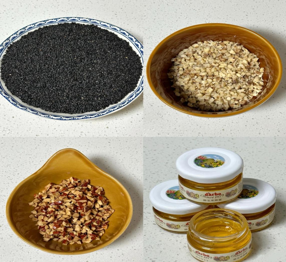1. 将黑芝麻筛选干净炒熟。核桃仁烤熟切成小颗粒,红枣去核切成小丁,所有材料处理好后混合均匀。