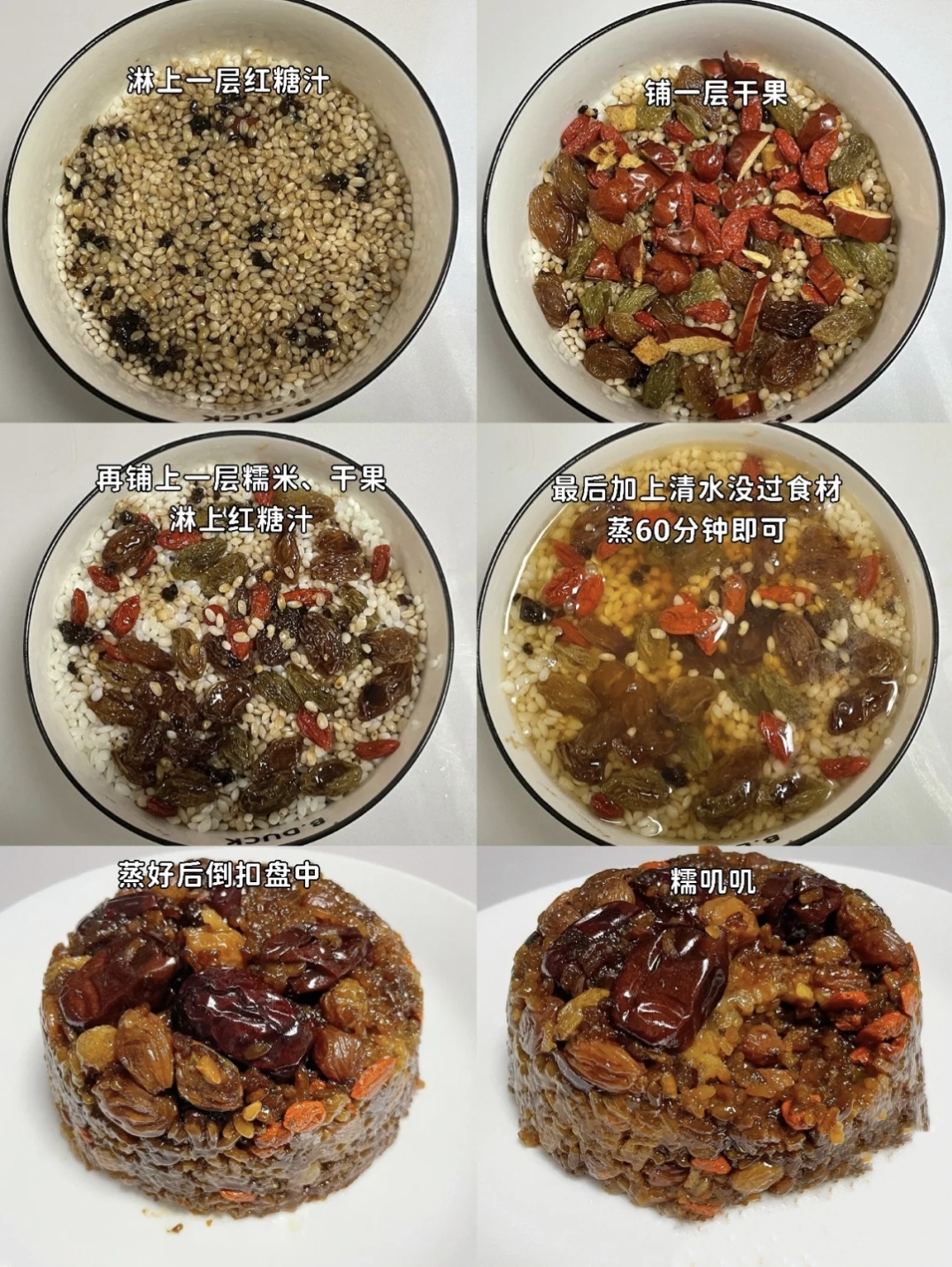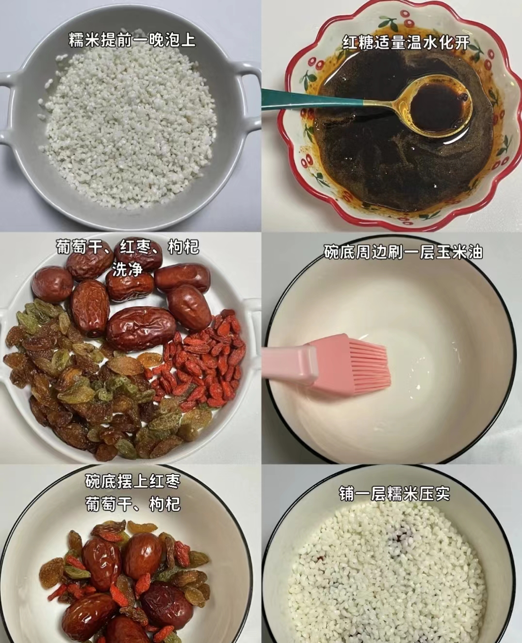 食材:糯米、红枣、红糖、葡萄干、枸杞
