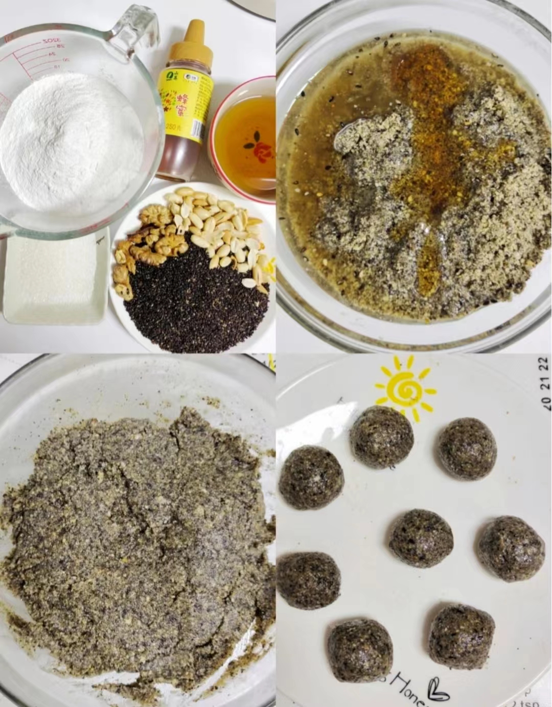 1.把花生仁,黑芝麻,核桃仁,白糖放入料理机中打碎,然后放猪油和蜂蜜搅拌均匀,搓成7-8克的圆球放冰箱冷冻30分钟。