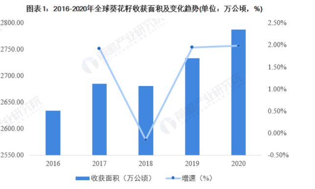 2016-2020年,全球葵花籽收获面积整体呈现上升趋势。2020年,全球葵花籽收获面积达到了2787.43万公顷,相比2019年上升了1.98%。