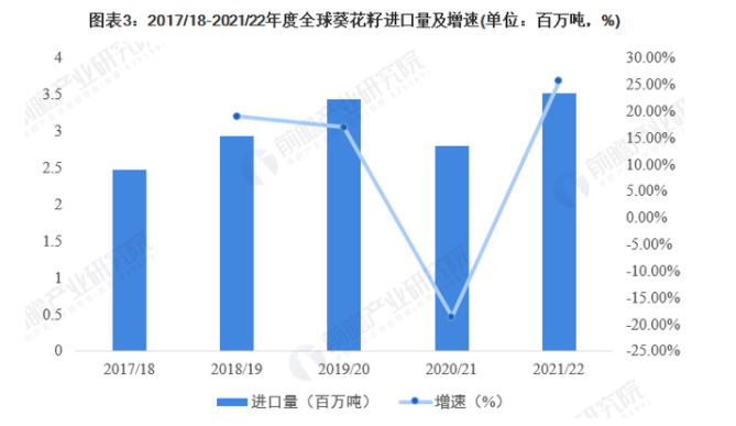 2017/18-2020/21年度,全球葵花籽进口量整体有所上升。2020/21年度,全球葵花籽进口量达到了2.80百万吨,与2019/20年度相比下降了18.60%。根据美国农业部于2021年12月的预测数据,2021/22年,全球葵花籽进口量将回升至3.52百万吨。