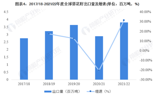 2017/18-2020/21年度,全球葵花籽出口量先上升再下降。2020/21年度,全球葵花籽出口量达到了2.90百万吨,较2019/20上升9.37%。根据美国农业部于2021年12月的预测数据,2021/22年,全球葵花籽出口量将大幅上升至3.81百万吨。