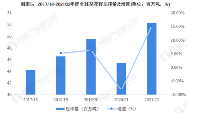 2017/18-2020/21年度,全球葵花籽高点接近5000万吨。2020/21年度,全球葵花籽压榨量达到了45.43百万吨,较2019/20下降8.26%。根据美国农业部于2021年12月的预测数据,2021/22年,全球葵花籽压榨量将上涨至52.33百万吨。
