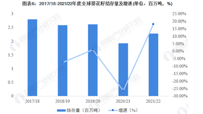 2017/18-2020/21年度,全球葵花籽结存量整体呈下降趋势。2020/21年度,全球葵花籽结存量为1.93百万吨,相比2019/20年度下降26.34%。根据美国农业部于2021年12月的预测数据,2021/22年,全球葵花籽结存量将上升至2.28百万吨。