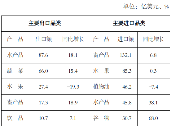 前三季度,我国对RCEP其他成员国主要农产品出口品类是水产品、蔬菜、水果、畜产品和饮品,出口额分别为87.6亿美元、66亿美元、27.4亿美元、17.3亿美元和10.7亿美元。除水果出口额下降19.3%以外,水产品、蔬菜、畜产品和饮品出口额分别增长18.1%、15.4%、18.9%和7.1%。我国自RCEP其他成员国主要农产品进口品类是畜产品、水果、植物油、水产品和谷物,进口额分别为132.1亿美元、85.3亿美元、46.2亿美元、45.8亿美元和30.7亿美元。除植物油进口额下降7.4%以外,畜产品、水果、水产品和谷物进口额分别增长6.8%、0.3%、38.1%和68%(表2)。