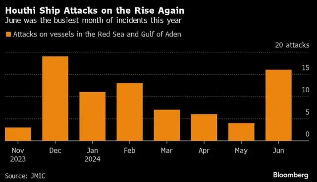 据财联社报道,统计显示,也门胡塞武装6月份在红海和亚丁湾区域对商船发动了2024年迄今为止数量最多的袭击,这显然再次证明全球海运市场面临的威胁可能难以迅速化解。