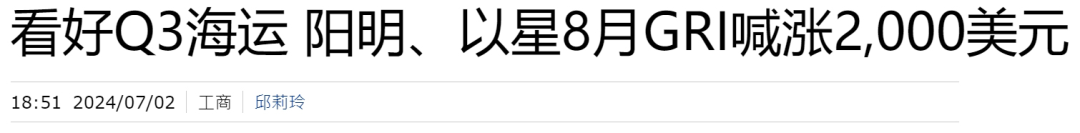 此前,阳明在6月底法说会也释出利多信号,第三季进入欧美传统旺季,海运业船舶火力全开,支撑运价涨势。