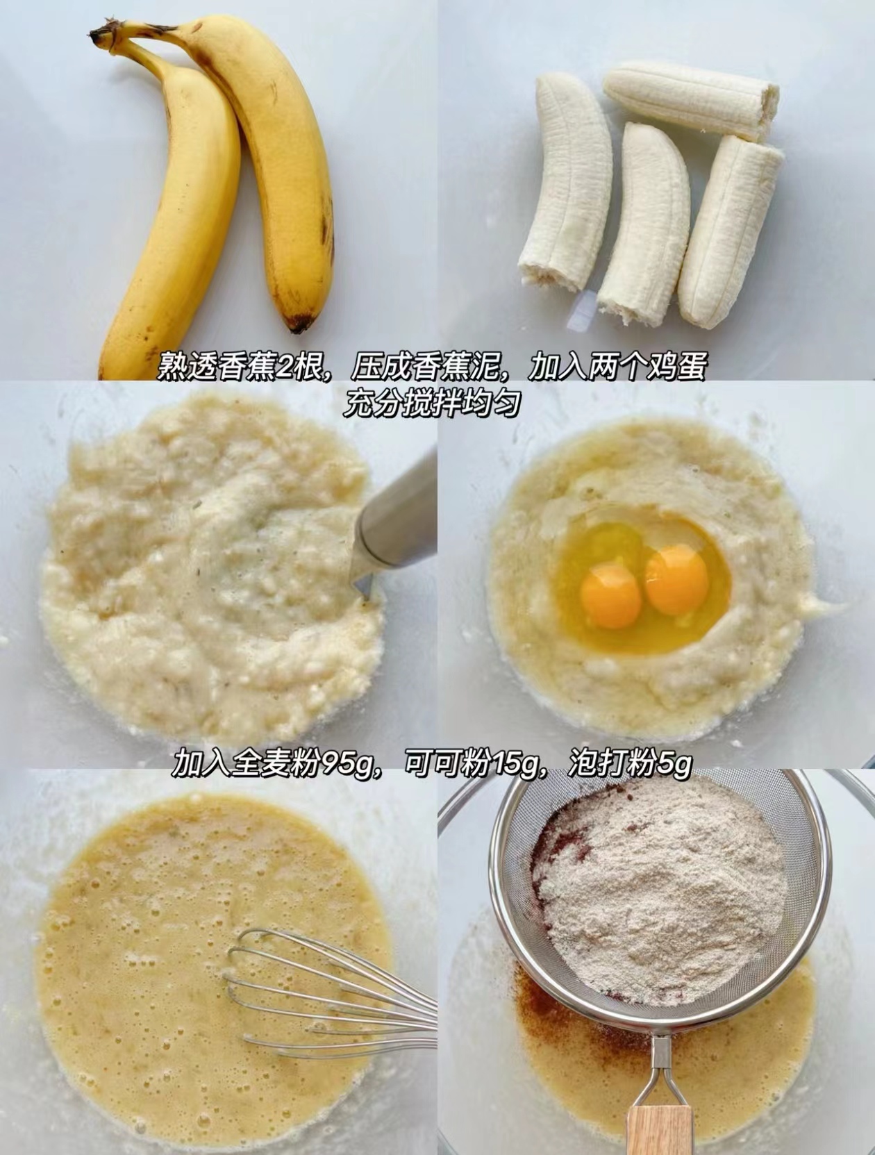 把香蕉压成香蕉泥,加入鸡蛋充分搅拌均匀。