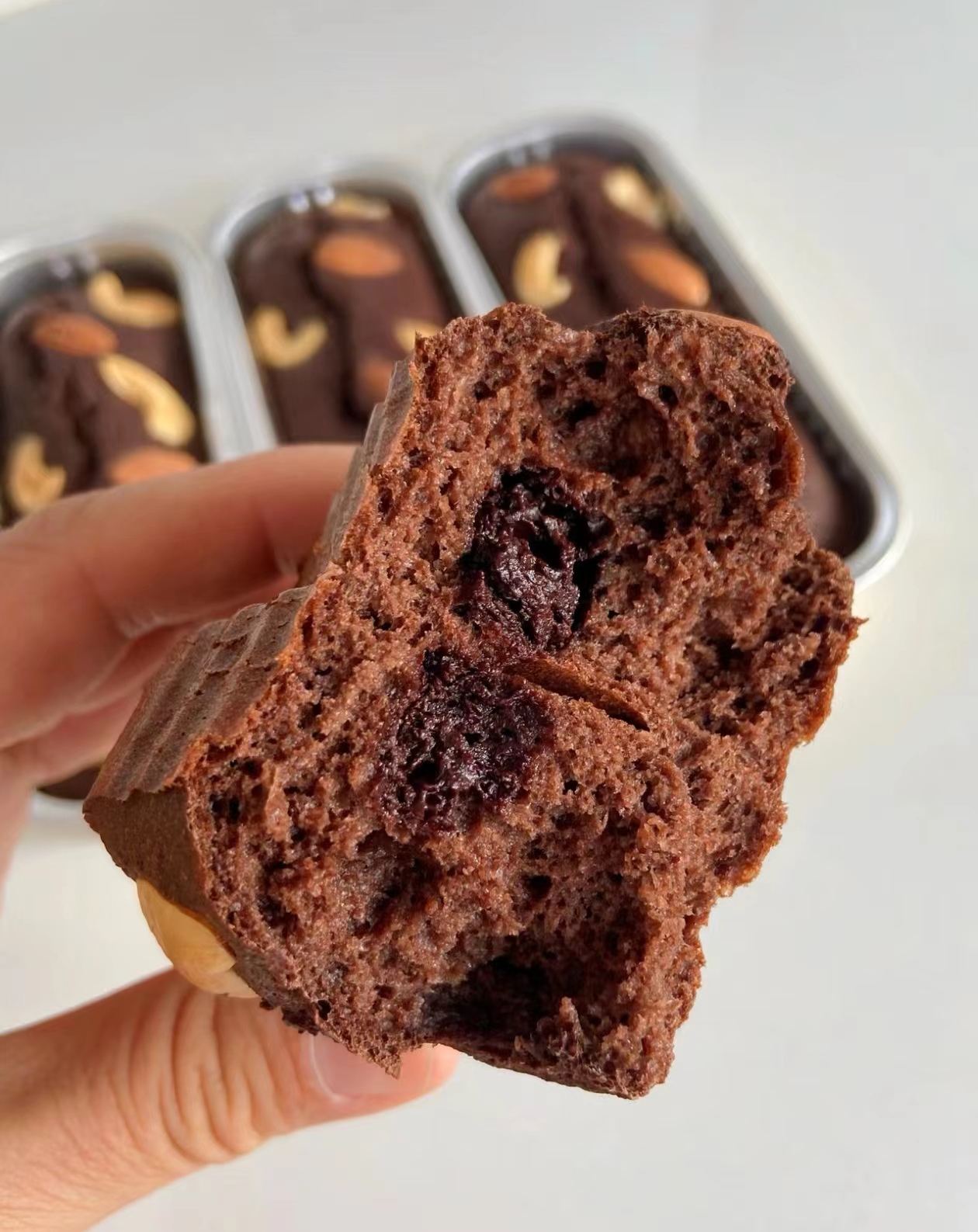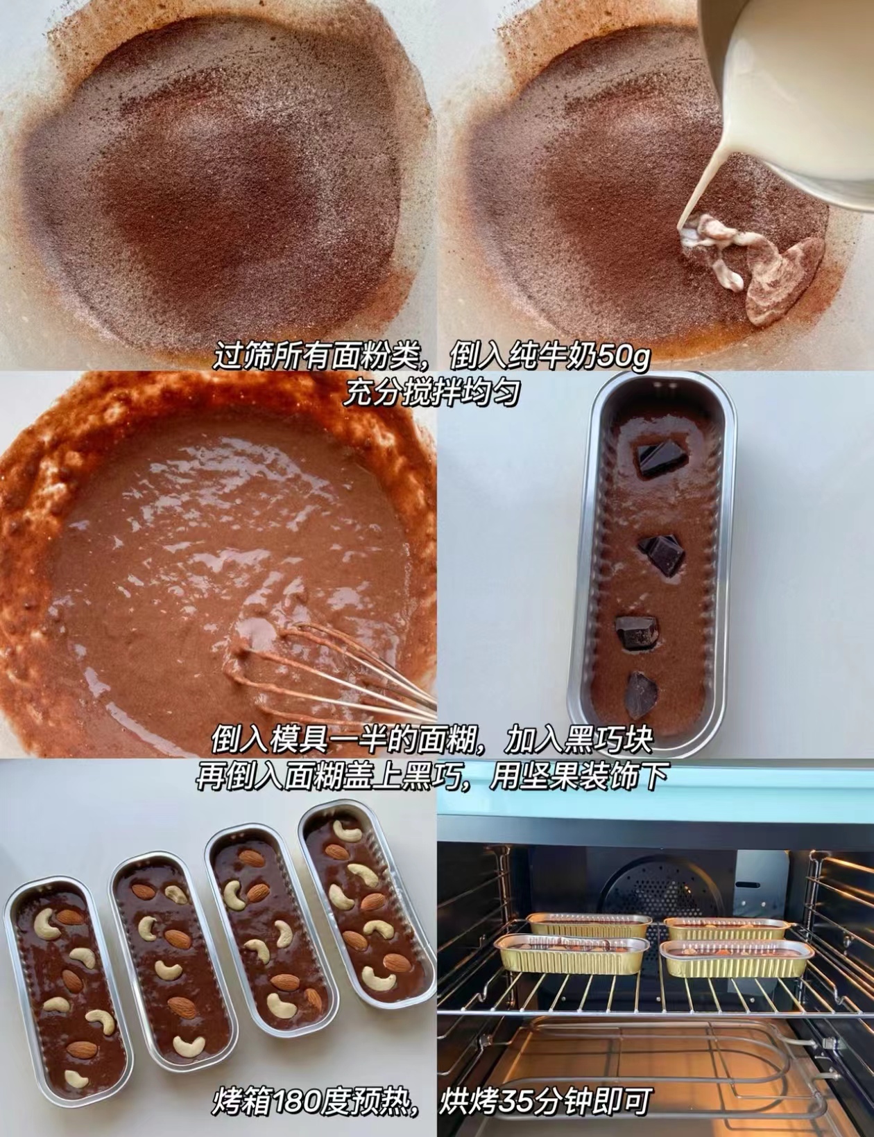 倒入模具中一半的面糊,加入黑巧块,再盖一层面糊,加入腰果和巴旦木。