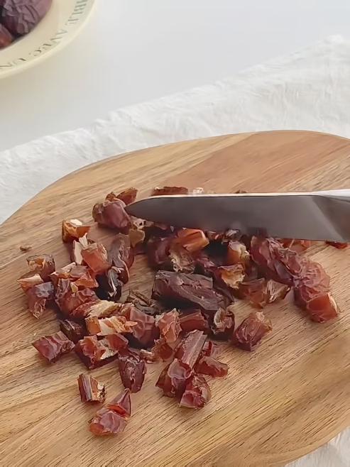 1.将碧根果和蜜枣一起打成坚果酱。