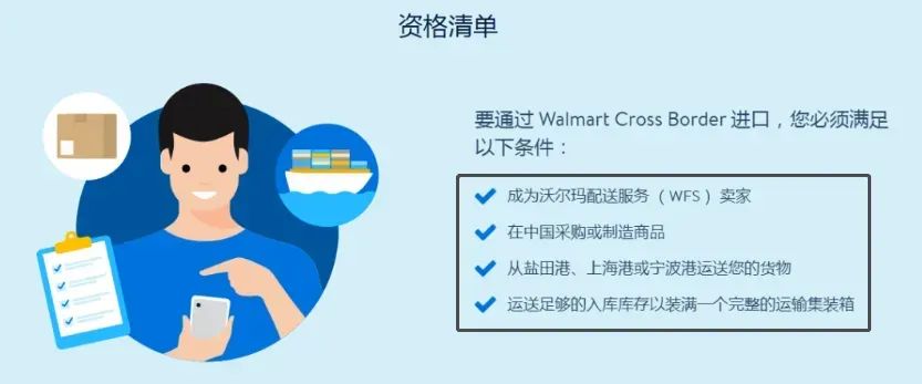 介绍显示,要想通过沃尔玛的Walmart Cross Border (WCB)进口货物,并须满足以下四个条件: