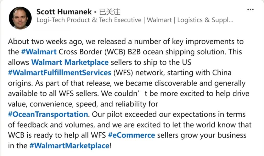 近日,沃尔玛相关负责人Scott Humanek在社交媒体透露:大约两周前,沃尔玛对WCB B2B海运解决方案进行了一些关键改进,这使得沃尔玛市场的卖家可以直接通过沃尔玛的跨境海运解决方案,将中国制造的商品运送到沃尔玛的美国配送中心网络。