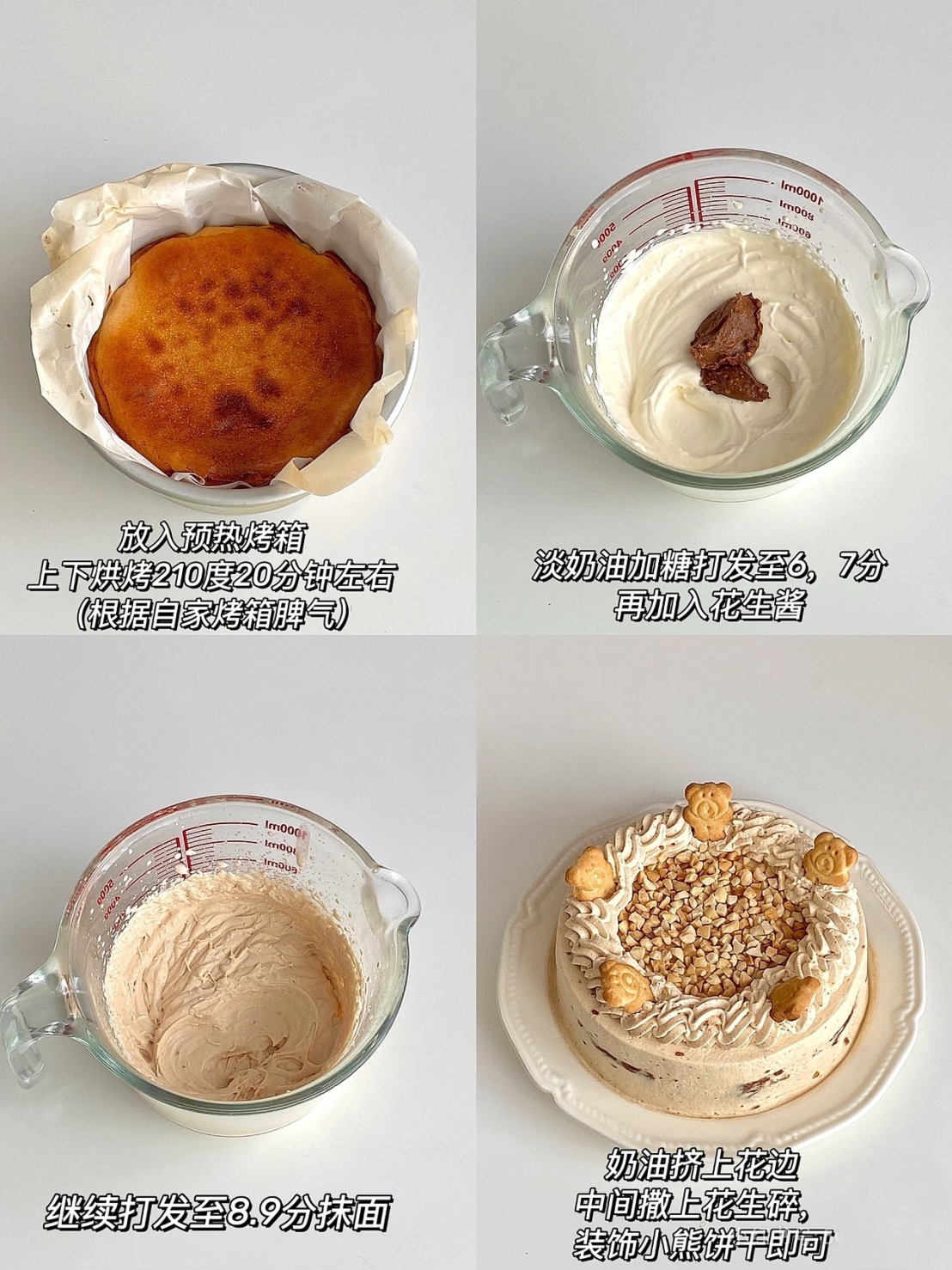 6、外层抹上奶油,顶部挤上花边,中间撒上花生碎装饰上小熊饼干即可。