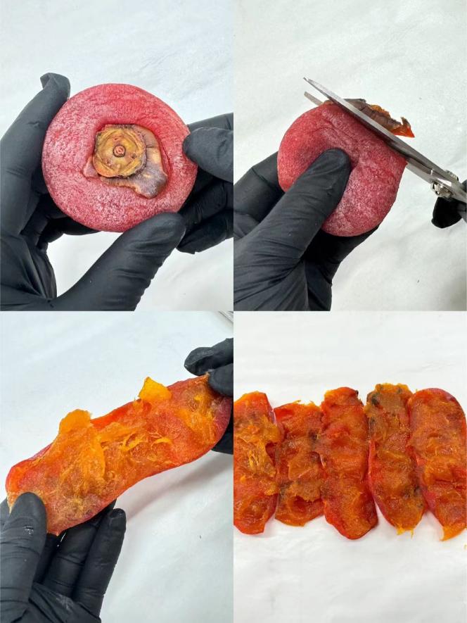 1、 柿饼去头去尾,用剪刀剪开