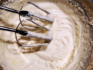 步骤2:将淡奶油加入15克代糖打至6、7分发,就是这种纹理清楚,但流动性变差就可以了,不必过分打发。