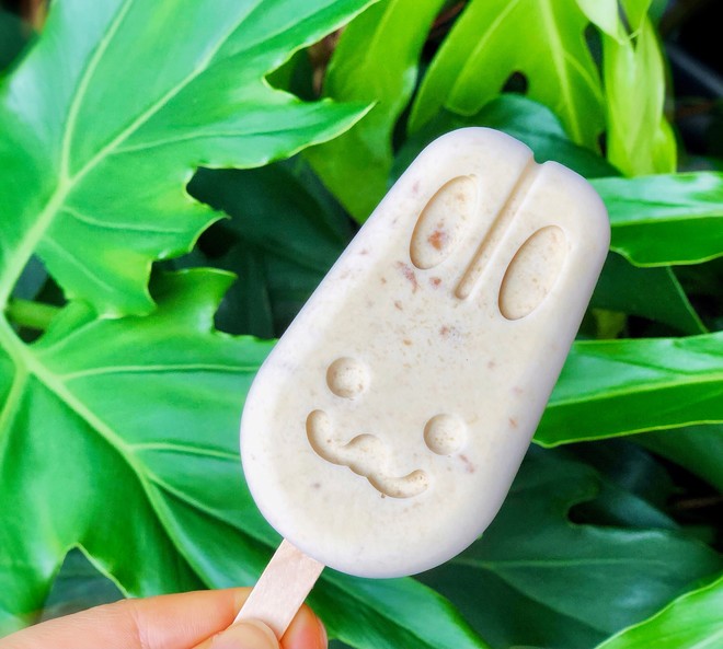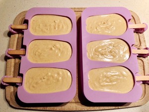 步骤4:倒入硅胶雪糕模,轻震平表面(可以在倒雪糕糊前放在一个托盘上,方便震模和端进冰箱)。放进冰箱冷冻4小时以上或过夜。