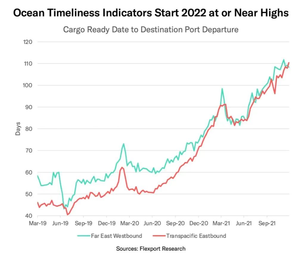 在跨太平洋东行航线上,从2019年疫情前的平均运输时间为45至50天到2022年1月2日的最新测量的110天的历史新高,表明拥堵和瓶颈问题正在恶化。