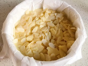 7.先将苹果薄片一层层铺入蛋糕模具,然后倒入蛋糕糊,最后撒上杏仁片。