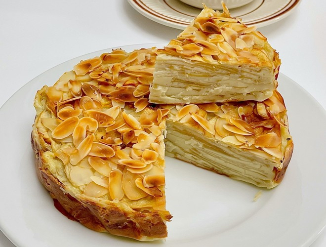 今天给大家分享一款超级简单的法式苹果千层蛋糕做法,低油低脂又有营养,千层指的是里面层次分明的苹果片喔,蛋糕表面铺满了杏仁片,烘焙过后口感细腻,香气诱人,快来一起试试吧!