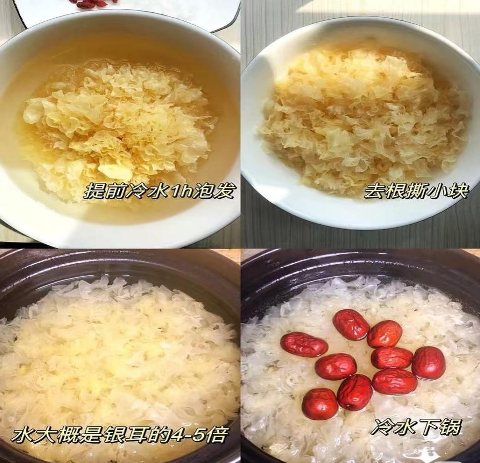 1.银耳冷水泡1h左右,去除黄色的根,用手将银耳撕成小片,控水备用。